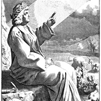 Lucretius pointing to the casus, the downward movement of the atoms, from the frontispiece of a 1714 edition of Thomas Creech’s translation of Lucretius (1682).