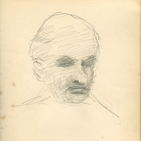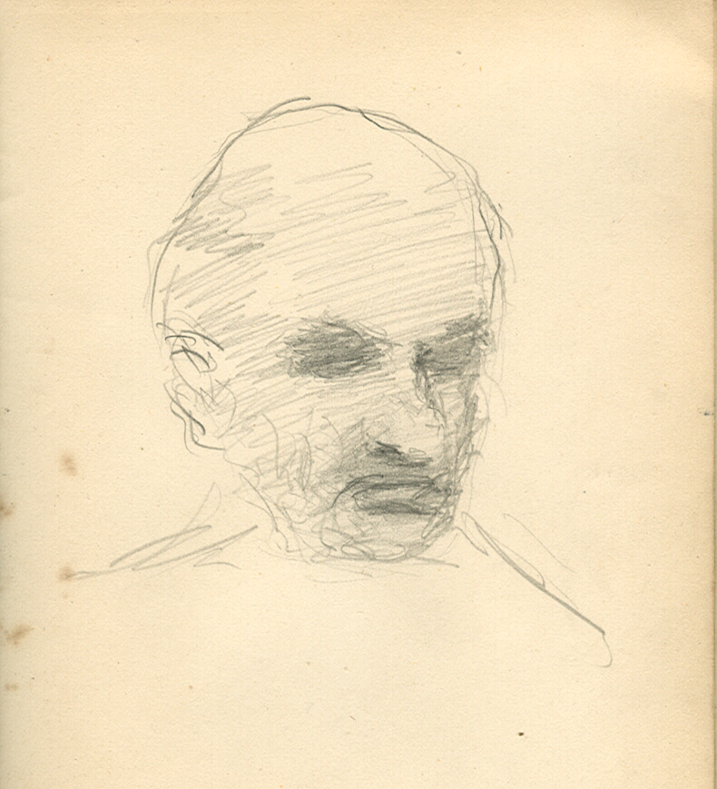 This piece is a rough sketch of a bald yet bearded man's head. His features are not fully developed but he has an obvious scowl.