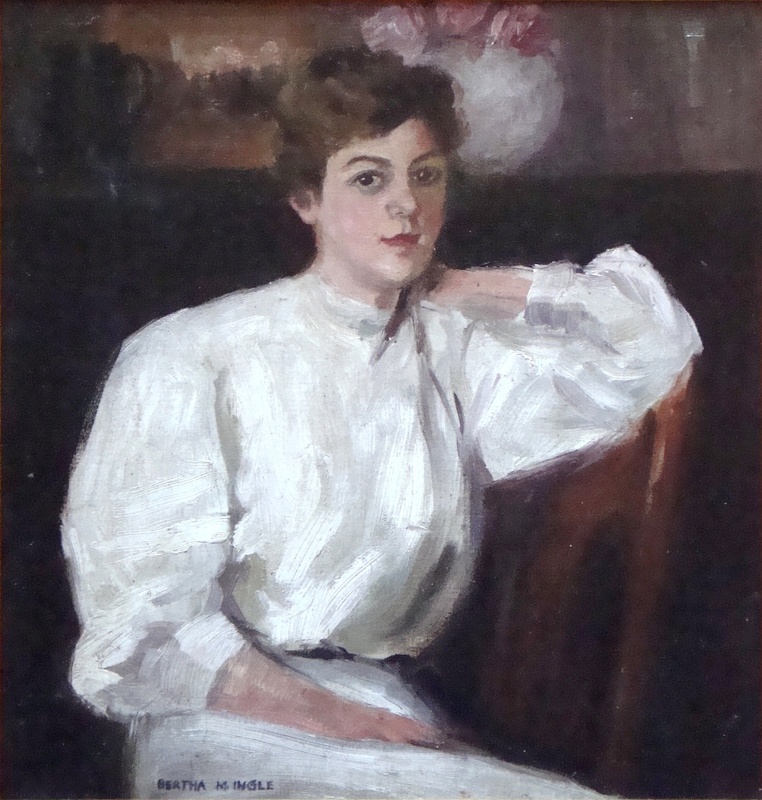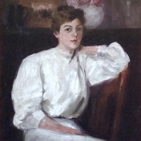 This piece shows a young woman in a white dress sitting on an angle to the viewer, toward the right of the viewer, but looking out directly. She sits with one arm on the back of the chair and the other resting in her lap.