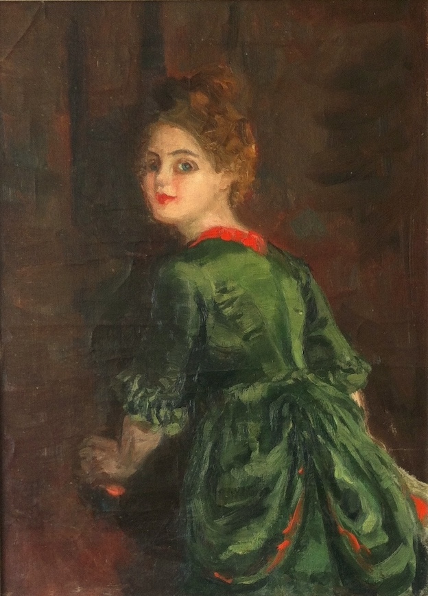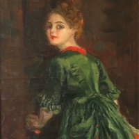 This piece shows a young woman, with her brown hair up in a bun, wearing a green dress with red trim. She has her hand on a door knob with her back to the viewer but looks over her shoulder to address the viewer directly.