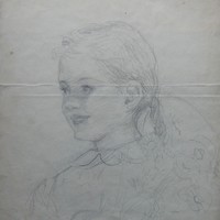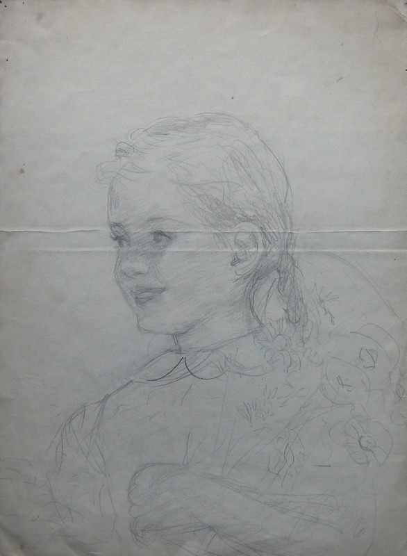 This piece shows a young girl in a pony tail from the shoulders up. She is on an angle to the left of the viewer, wearing a dress with a frilly collar, and holding a bouquet of flowers in her left arm.