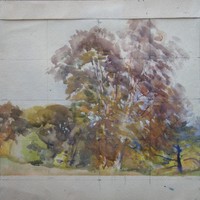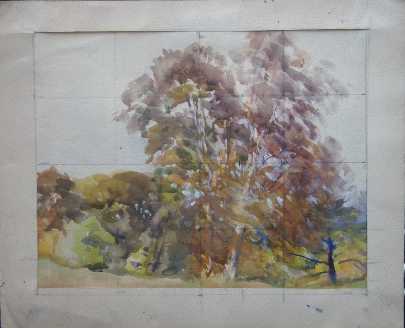 This piece shows a group of trees with autumn leaves. The two largest and most prominent trees are birches that are just right of center. This piece was done on a grid which usually indicates Ingle was planning on doing another iteration of a different size.