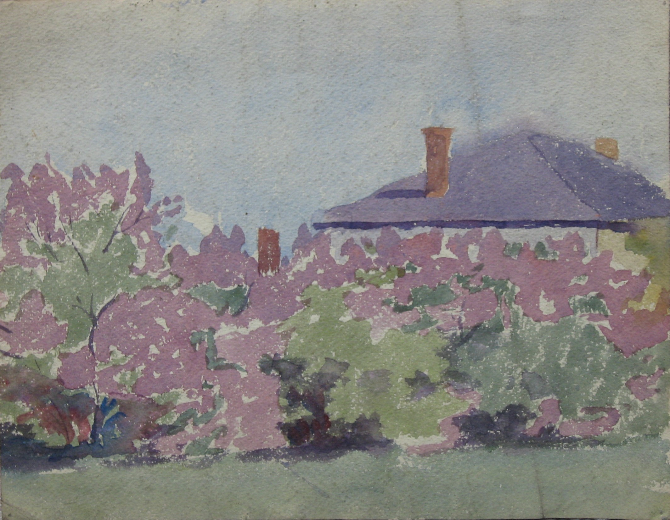 This piece shows a row of lilacs in bloom in front of a small house. Only the roof and chimney are visible beyond the shrubs.