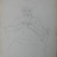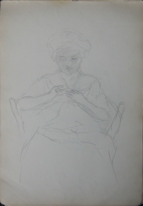 This piece shows a woman sitting in a wooden chair sewing. She is wearing a long dress, and a bonnet, and sits facing the viewer directly. This is part of a sketch book containing drawings 0315-0367. This is likely the same woman as piece 0324.