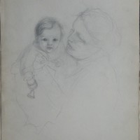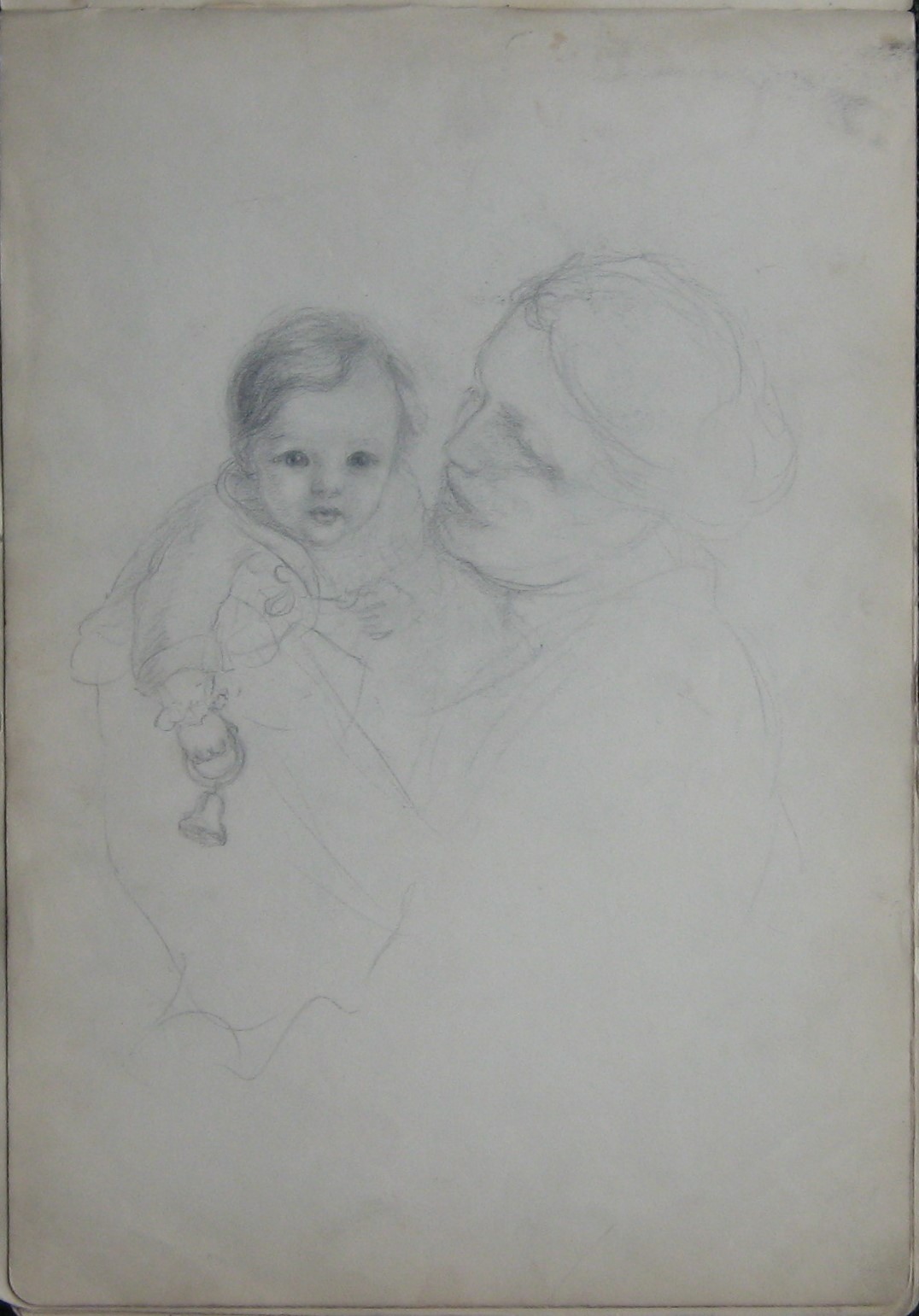 This piece shows a woman, on an angle to the left, holding a baby, facing the viewer. The baby is dressed in a gown and holds a ring that has a bell on the end. This is part of a sketch book containing drawings 0315-0367.