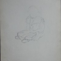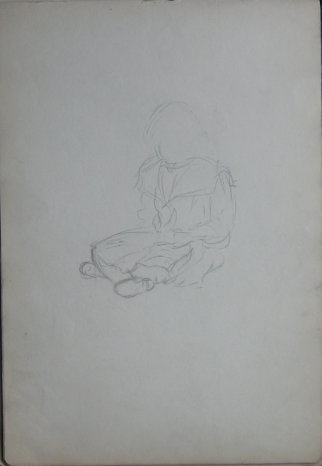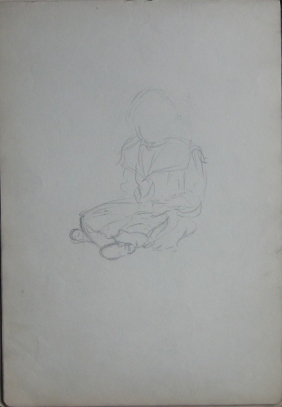 This piece is a quick sketch of a girl in a wide collared dress, sitting on the floor at an angle to the left of the viewer. This is part of a sketch book containing drawings 0315-0367.