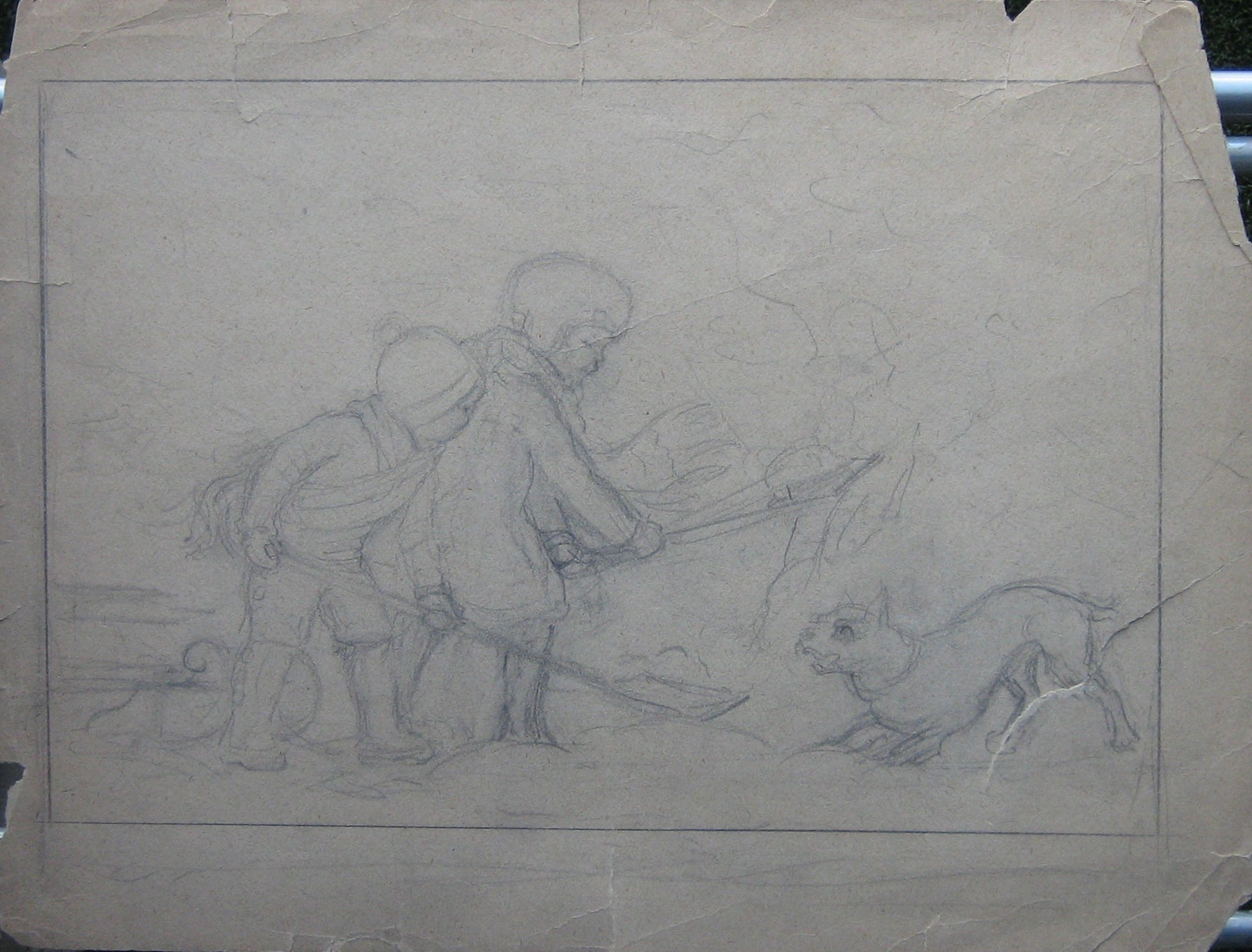 This piece shows two children, in profile facing right, shoveling snow. A small dog, in the right corner, takes a playful stance towards the children. This is the front side of the piece 0242.