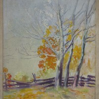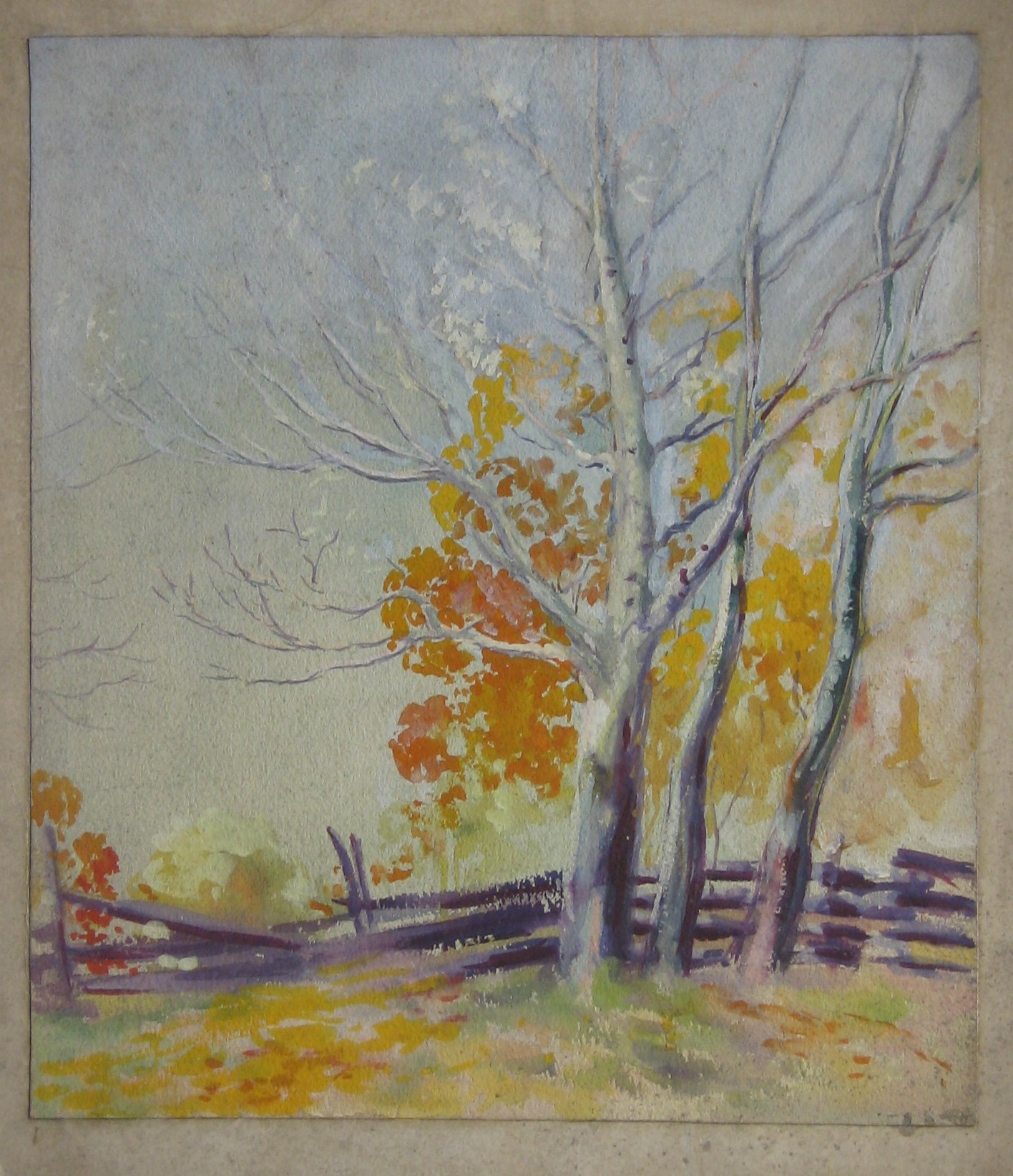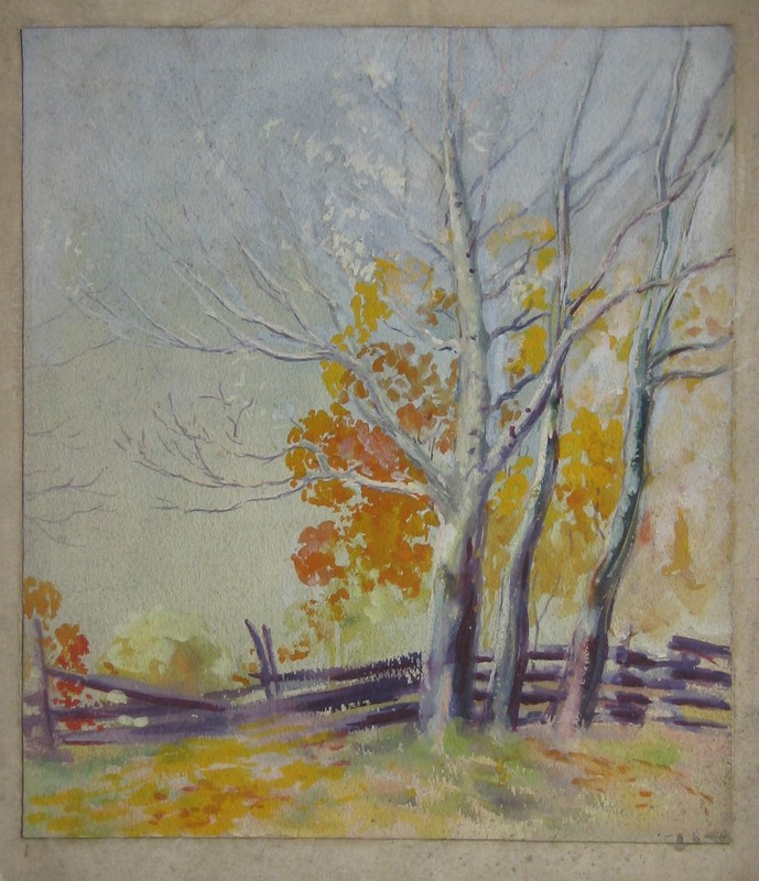 This piece shows a group of three trees, on the right, in front of a rail fence.
