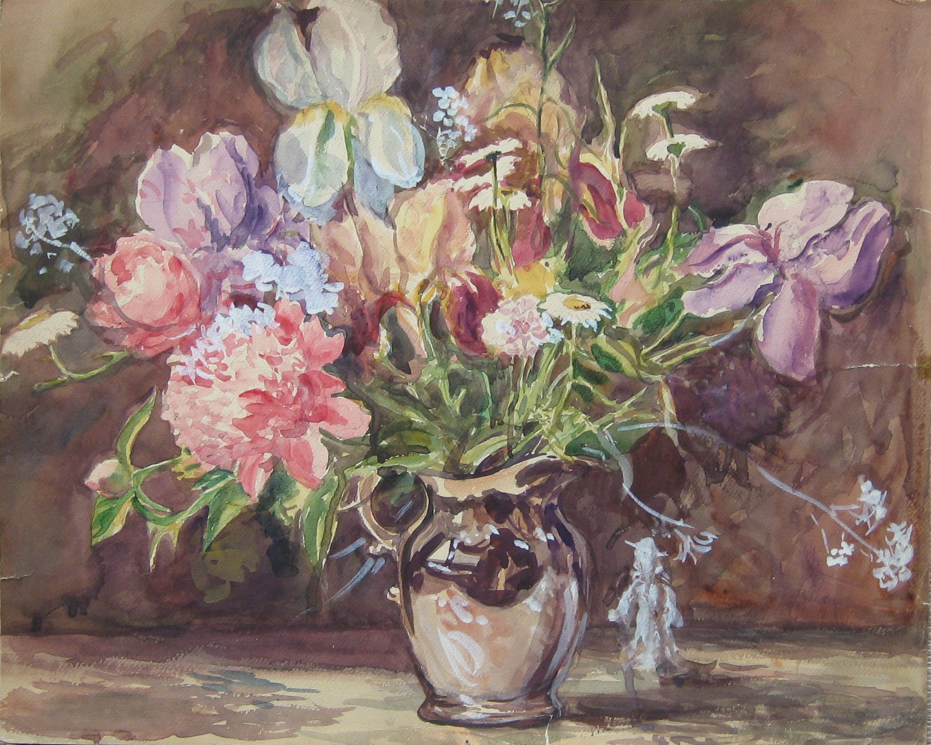 This piece shows a large flower arrangement, mostly consisting of pink, purple, and coral flowers. The arrangement is in a small silver pitcher with a looped handle.