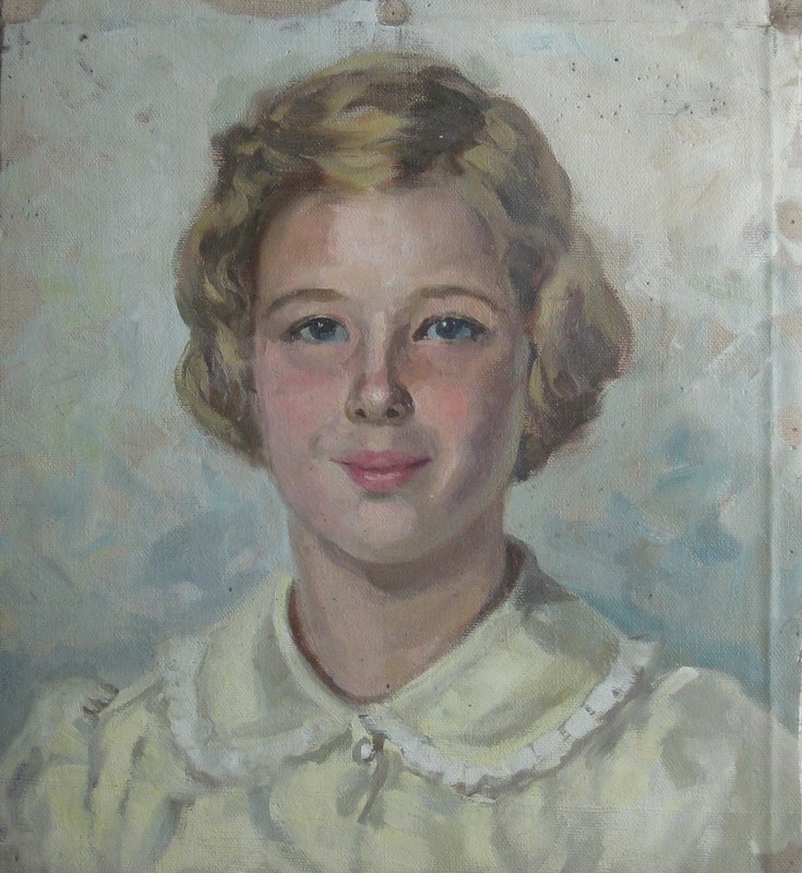 This piece shows the artist's great-niece as a teen, with jaw-length, wavy, fair hair. She is seen from the shoulders up in a wide collared cream coloured top, facing the viewer.