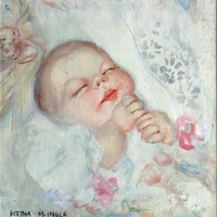This piece shows an infant sleeping, surrounded by a white material with flower patterns on it.