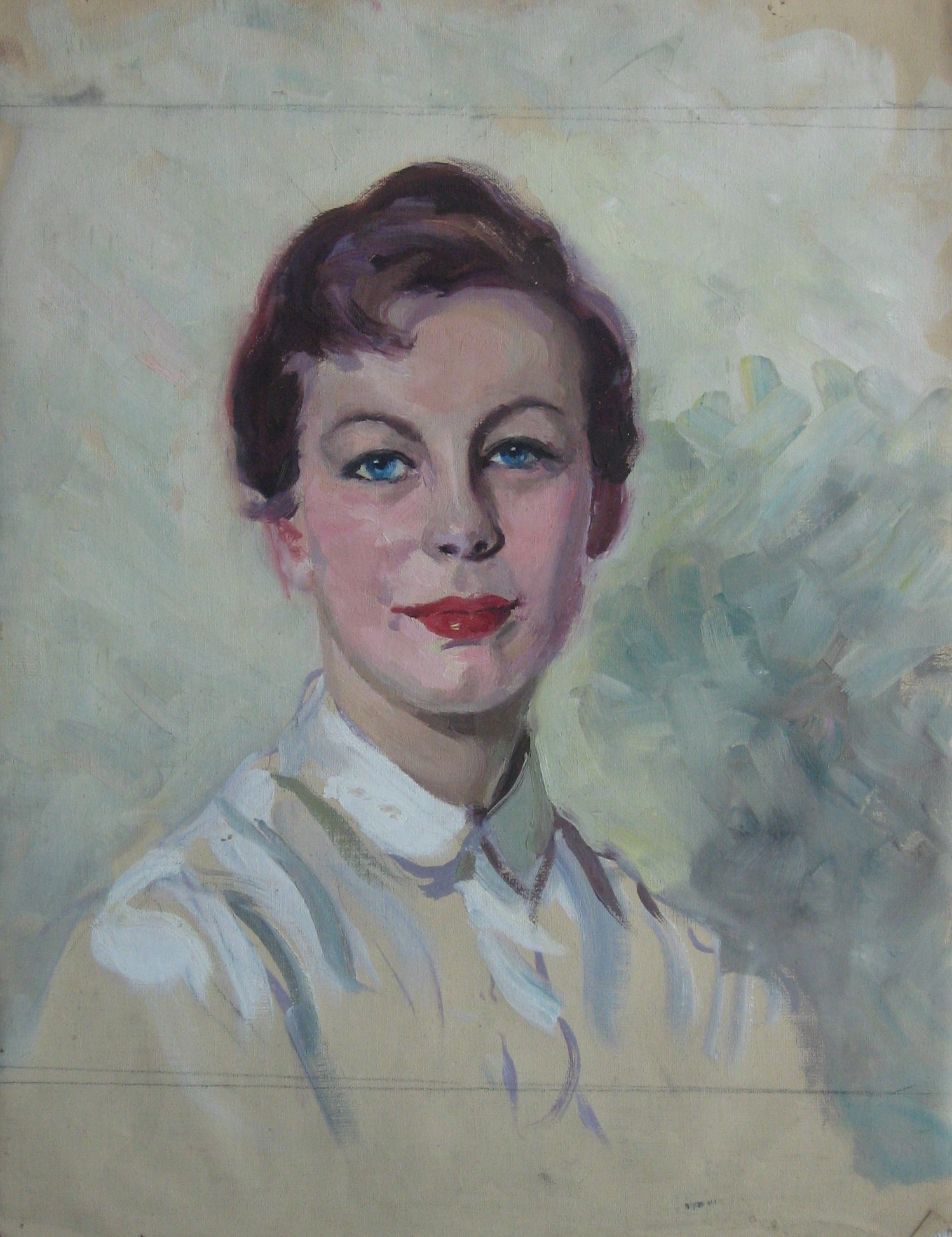 This piece shows a young woman with side-swept short brown hair and blue eyes. She is pictured from the shoulders up in a white, collared shirt on an angle to the right of the viewer but with her head turned towards them.