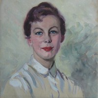 c. 1950: Based on the style of the painting and the fashions worn by the subject.