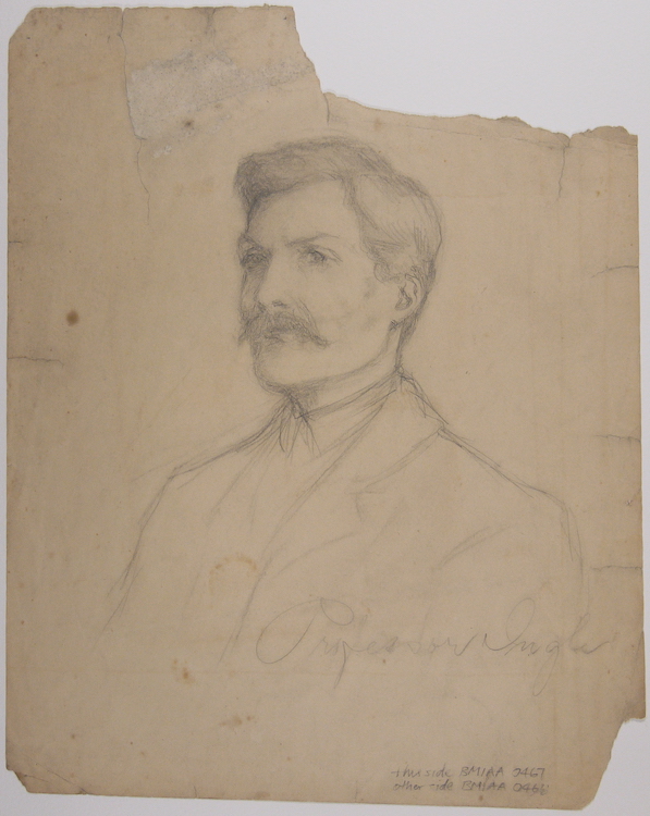This piece shows a young man with side-parted hair and a large moustache in a collared shirt and suit jacket. He is shown from the shoulders up on an angle to the left of the viewer. The piece is inscribed "Professor Ingle."