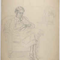 This piece shows a middle-aged, bespectacled woman sitting in an arm chair sewing. She is wearing a shin-length dress and a collared sweater, and is seated at an angle to the right of the viewer. To the right of the woman there is a side table with a radio on it.