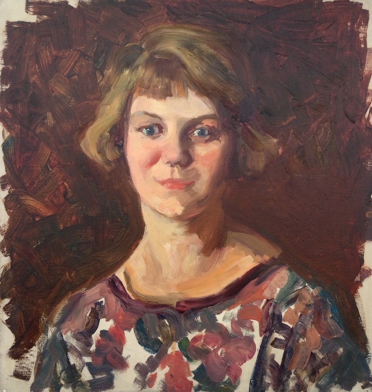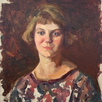 This piece shows a young woman with ear-length, golden brown hair. She is pictured from the shoulders up, looking at the viewer directly in a red and white patterned blouse.