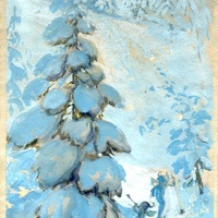 This piece shows two figures skiing down a large snow covered bank that is partially forested by evergreen trees, one of which features prominently on the left-hand side of the piece.