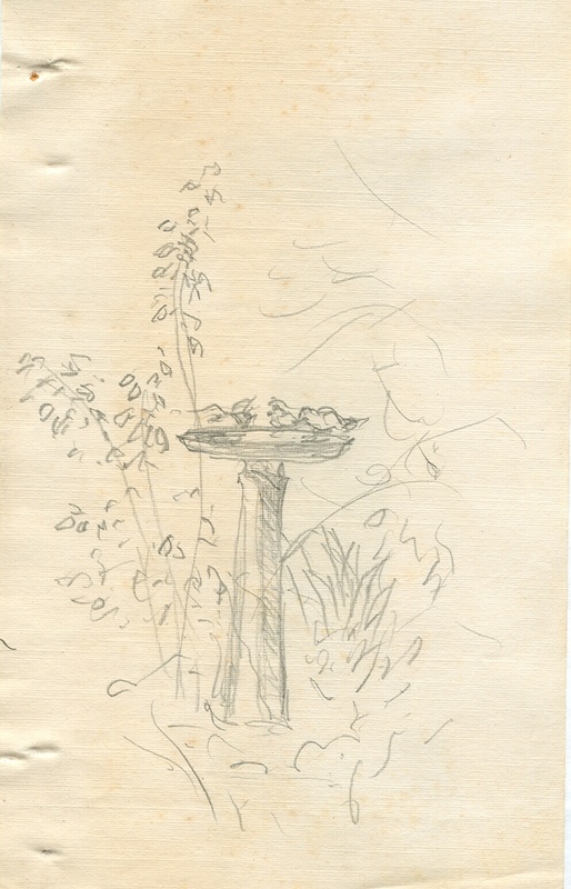 This piece shows a group of small birds in a bird bath at the top of a pillar surrounded by a variety of shrubs and grasses.