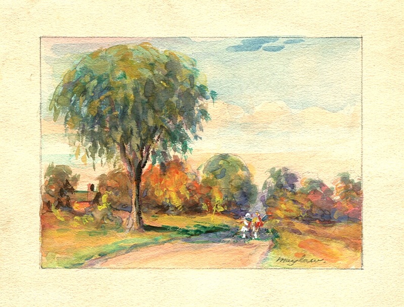 This piece shows two people walking down a country road under the shade of a large deciduous tree to the left. The roads leads through grass fields to a distant forest and a building.