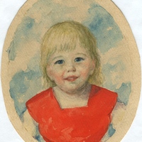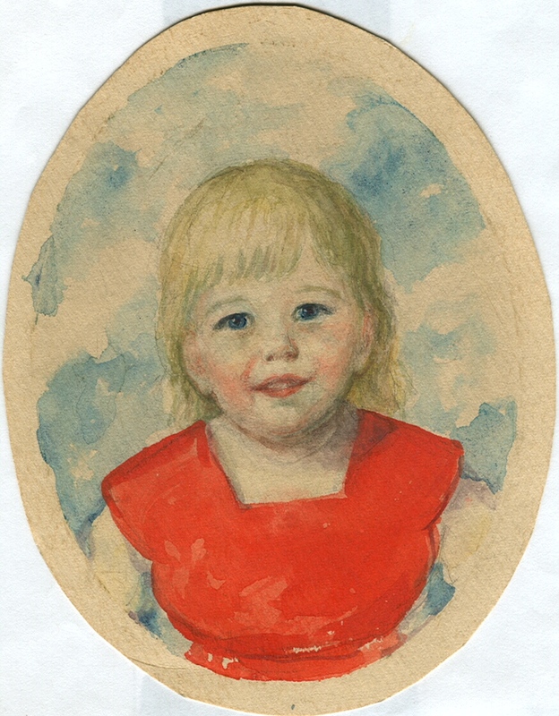 This piece shows a young girl from the waist up, with shoulder length blonde hair, wearing a red jumper and facing the viewer directly.