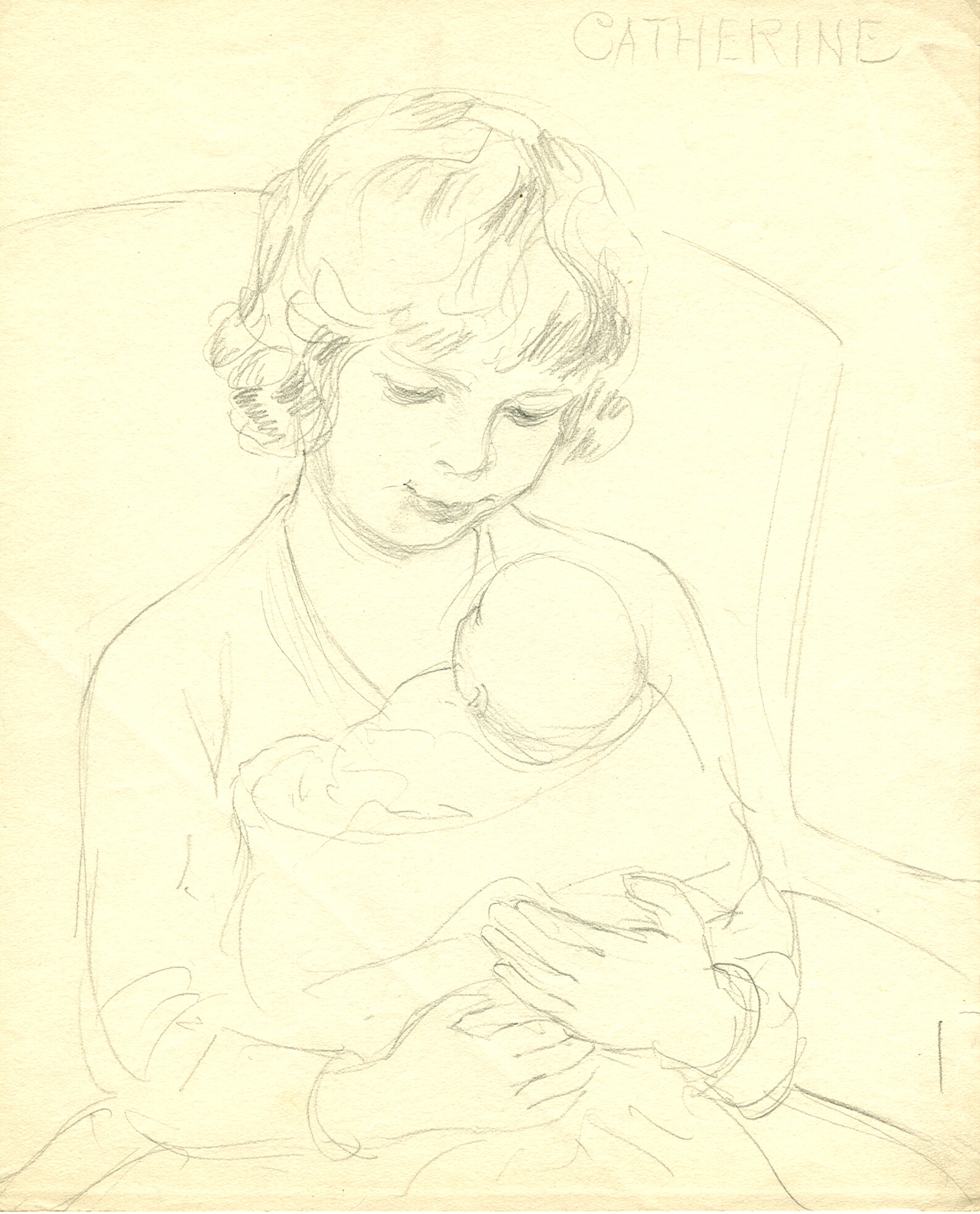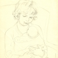 This piece shows a young girl sitting in an arm chair, holding a baby. She is shown from the waist up in a dress with wavy, jaw length hair. She is looking down at a baby that she is holding in her lap.