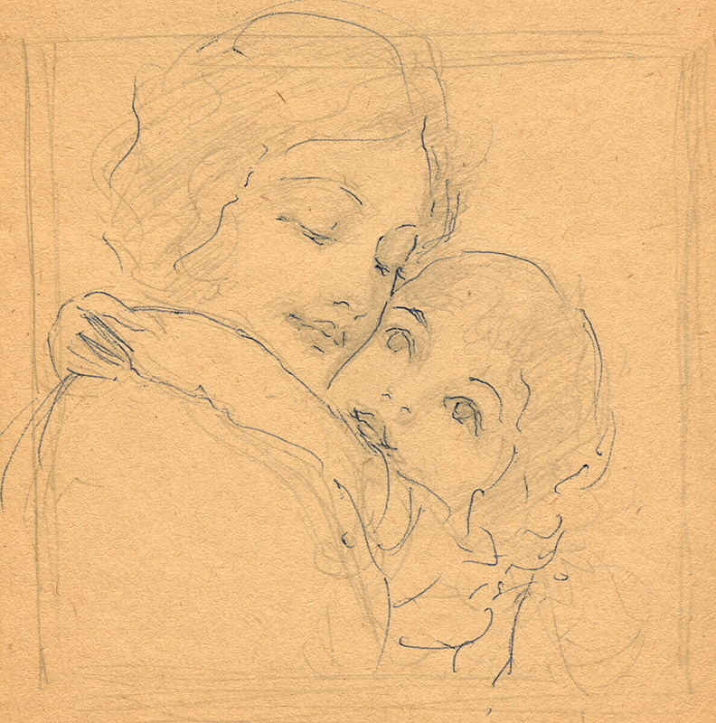 This piece shows a young girl reaching up to hug a woman around her neck. The two have their heads turned slightly towards the viewer so that they can be cheek to cheek.