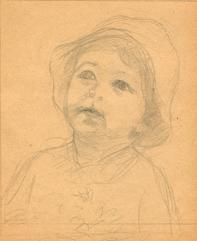This piece shows a young child from the shoulders up, wearing a bucket hat. They look up and to the left.