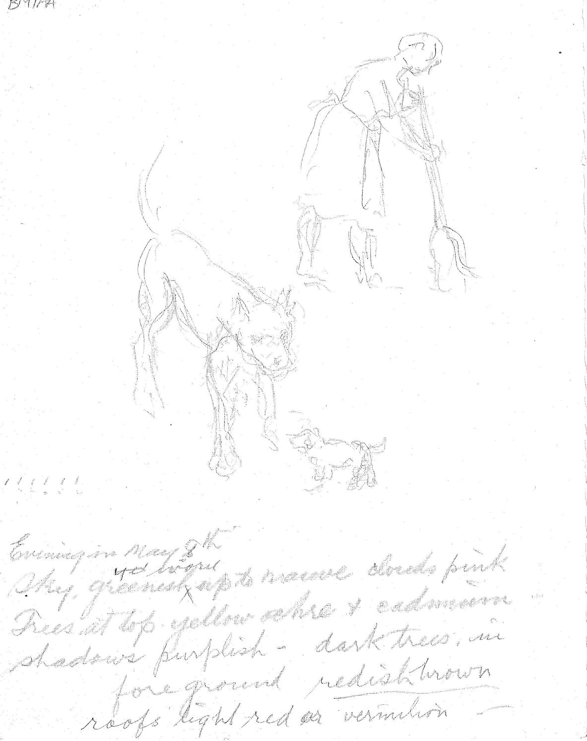 This piece shows a Dog and Cat looking at each other with a woman stooped over sweeping behind them. Ingle has written describing a landscape from the "Evening of May 8th."