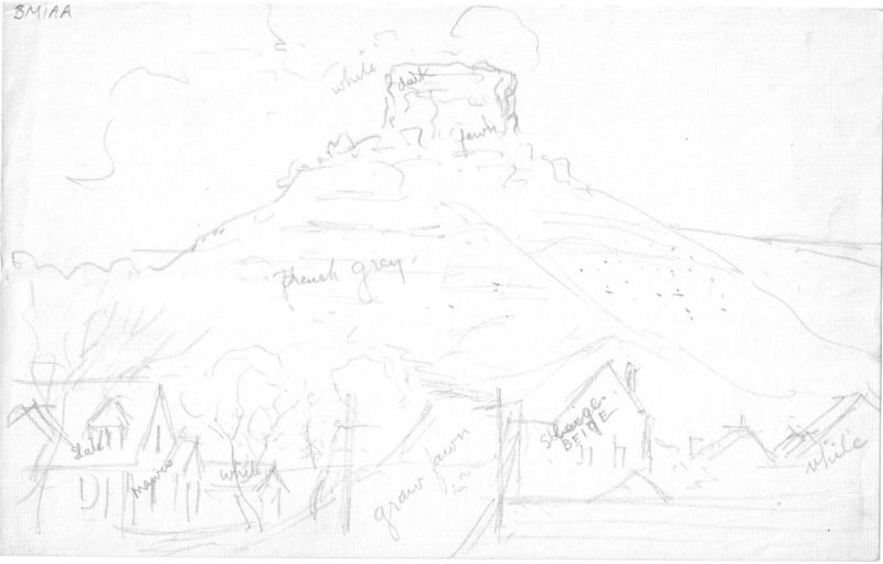 This piece shows a group of small houses at the foot of a pyramidal hill that has a square structure or monolith at its peak.
