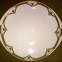 This is a platter that Ingle painted with a pattern of white glowers with green geometrical petals separated by green rectangles. this pattern goes all the way around the edge.