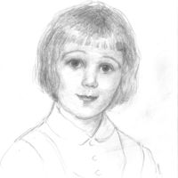 This piece shows a young girl with jaw-length straight hair in blouse and an apron dress. She is shown from the shoulders up, on a slight angle to the right, but looking directly at the viewer.