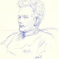 This piece shows a young man with short, curly hair wearing a crew neck top. He is shown from the shoulders up sitting on an angle to the left of the viewer. Ingle inscribed the piece with "Ray".