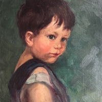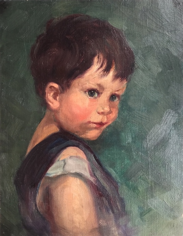 This piece shows a young boy with brown hair in a sleeveless shirt. He is shown from the shoulders up facing to the right with his head turned slightly toward the viewer.