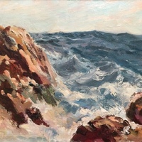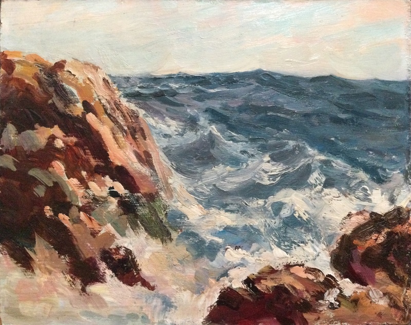 This piece shows red rocks, left side and lower right corner, that open up to a swelling sea.
