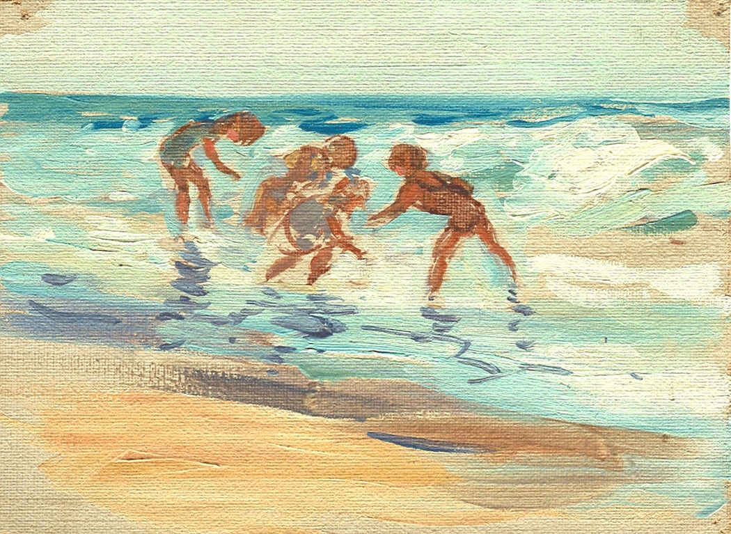 This piece shows a group of children splashing in the water at the beach. The piece is painted quickly but it looks as though there are roughly four of them.