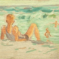 This piece shows a reclining young man from behind, propped on his elbows, looking out at the sea where there are two children playing.