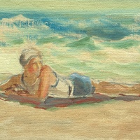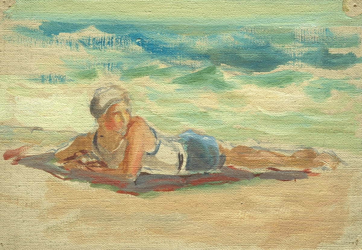 This piece shows a woman in a tank top, shorts, and a white swimming cap lying on her stomach at an angle to the left of the viewer. She is propped on her elbows and looking to the right, behind her there is a white capped sea.