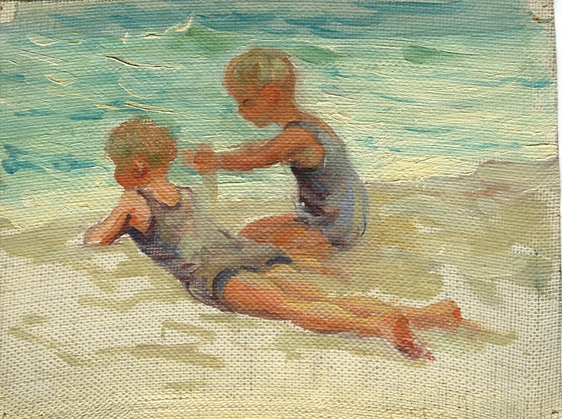 This piece shows a young boy covering another young boy with sand. The antagonist is sitting on the right, while the protagonist lies on his stomach.