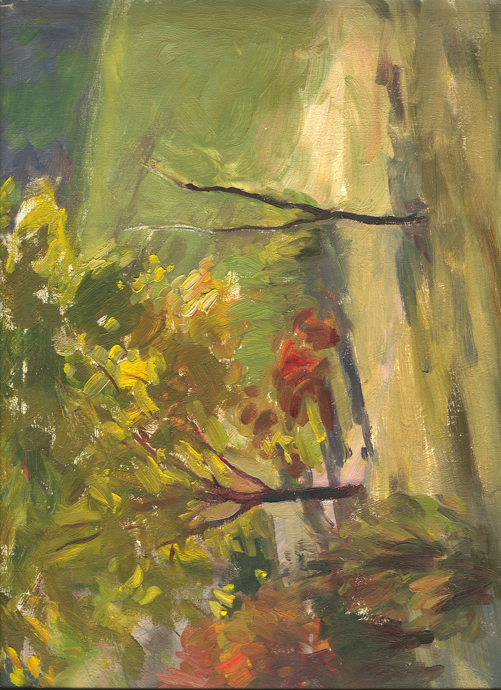 This piece shows a grass slope that descends towards a group of trees and brush to the left, and more grass to the right.