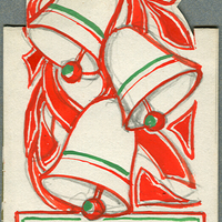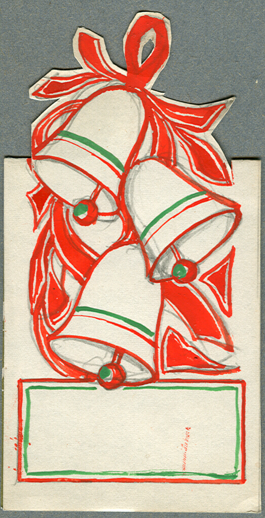 This piece shows a vertical composition of three bells tied together with red ribbon above a rectangle with a red and green border.