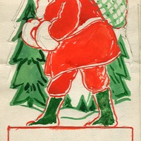This piece shows Santa Claus, in profile in front of evergreen trees, carrying a sack of toys on his back. The whole scene is above a rectangle a red border that has "Johnny Brown" written on it.